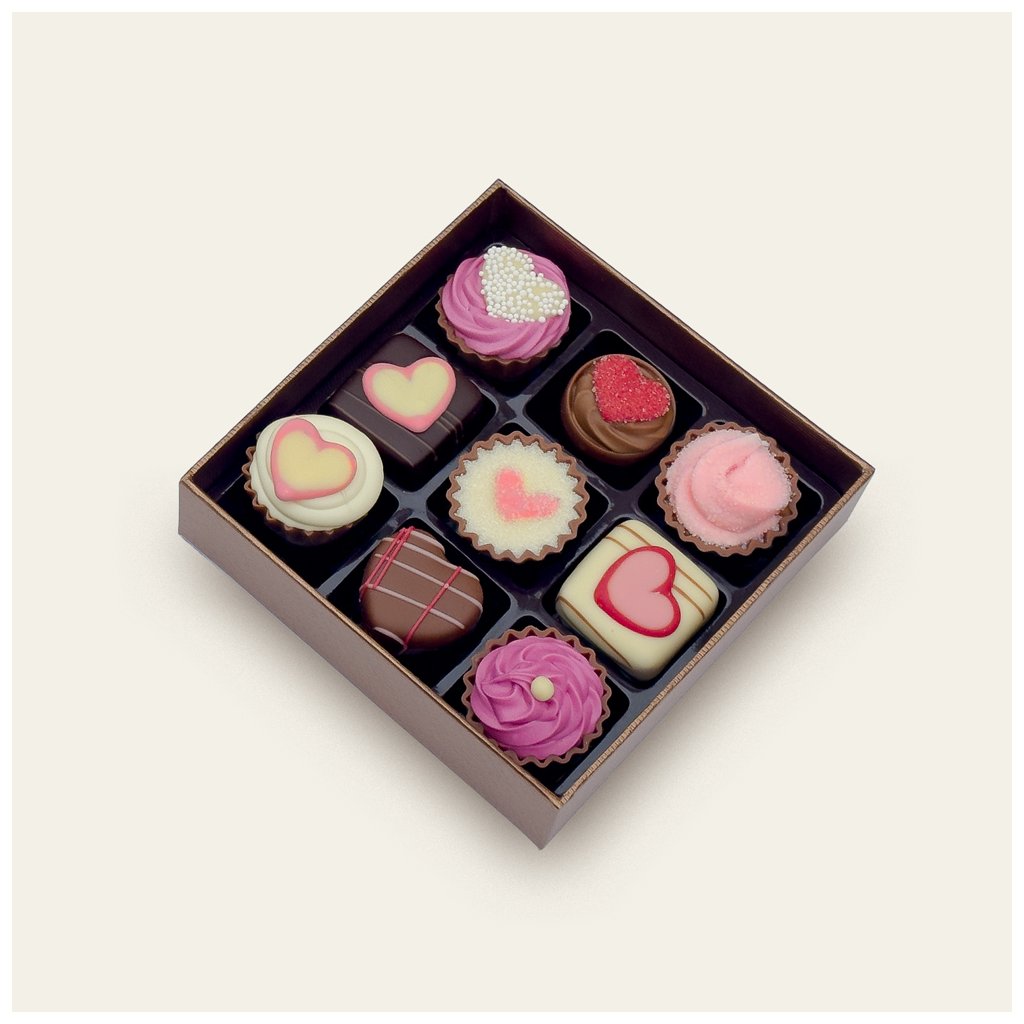 Luxusní bonboniéra sestavená z 9 ks pravých belgických pralinek z bílé, mléčné a hořké čokolády v stylové krabičce zlaté barvy o rozměru 12 x 12 cm. Každou pralinka má v krabičce svou přihrádku, takže jsou dobře chráněné. Krabička má plastový průhledný obal, takže je obsah krabičky v bezpečí a zároveň je na pralinky krásně vidět.