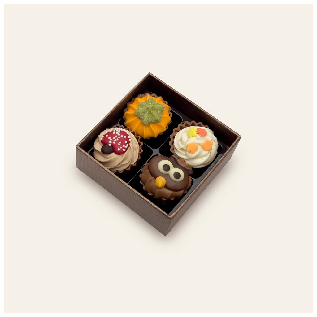 Luxusní bonboniéra sestavená z 4 ks pravých belgických pralinek z bílé a mléčné čokolády v stylové krabičce bronzové barvy o rozměru 8,5 x 8,5 cm. Každou pralinka má v krabičce svou přihrádku, takže jsou dobře chráněné. Krabička má plastový průhledný obal, takže je obsah krabičky v bezpečí a zároveň je na pralinky krásně vidět.