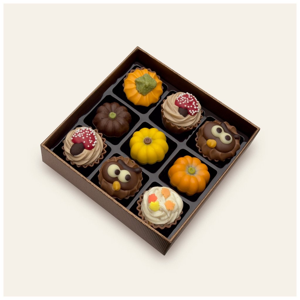 Luxusní bonboniéra sestavená z 9 ks pravých belgických pralinek z ve tvaru cupcaků bílé a mléčné čokolády v stylové krabičce bronzové barvy o rozměru 12 x 12 cm. Každou pralinka má v krabičce svou přihrádku, takže jsou dobře chráněné. Krabička má plastový průhledný obal, takže je obsah krabičky v bezpečí a zároveň je na pralinky krásně vidět.