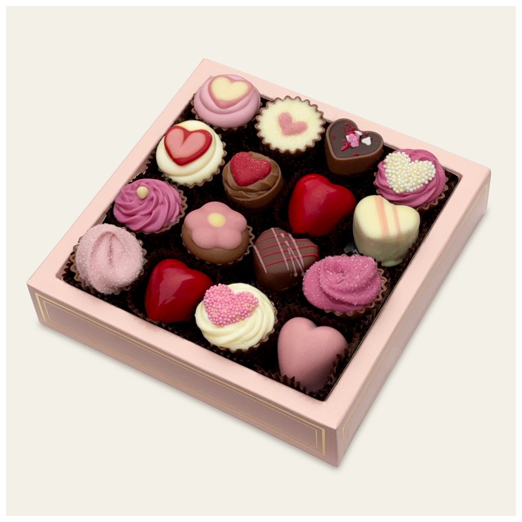 Bonboniéra 16 ks pravých belgických pralinek romantického ladění z bílé a mléčné čokolády v růžové krabičce rozměru 15 x 15 cm.