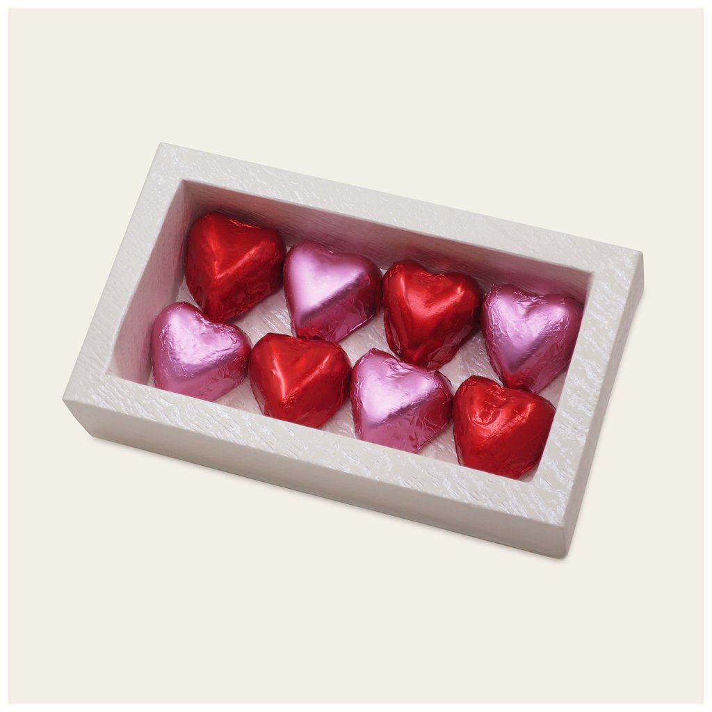 Bonboniéra 8 ks pravých belgických pralinek ve tvaru srdce z mléčné a tmavé čokolády v bílé krabičce rozměru 6 x 12 cm.