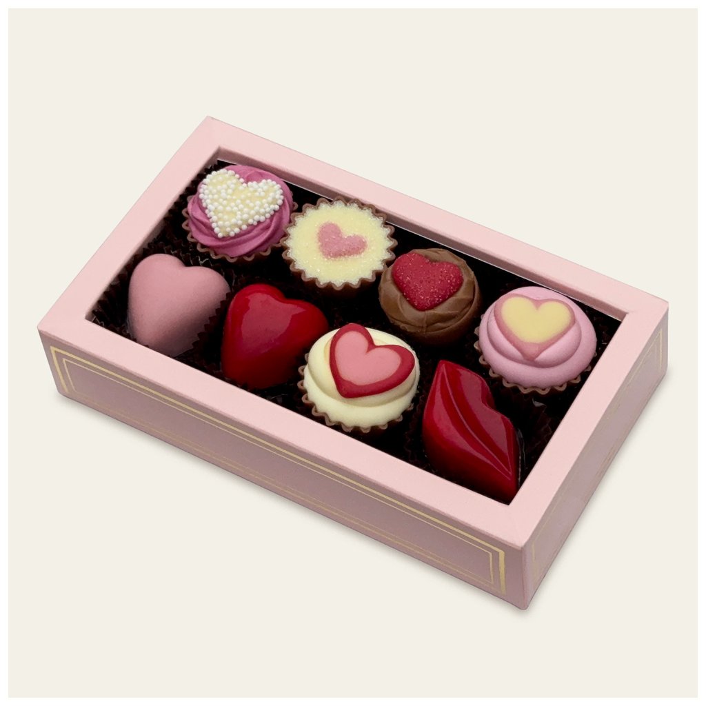 Bonboniéra 8 ks pravých belgických pralinek valentýnského ladění z bílé a mléčné čokolády v zlaté krabičce rozměru 8 x 15 cm.