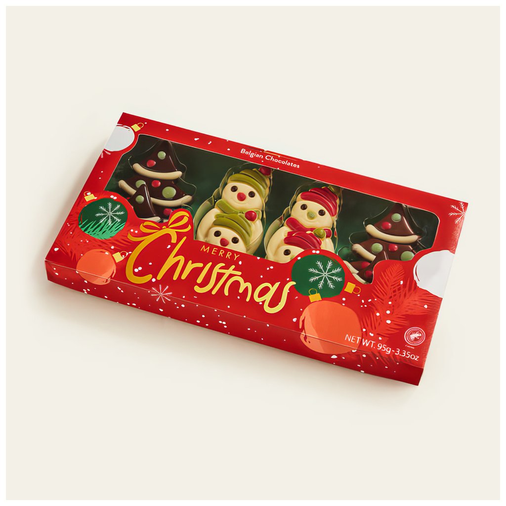 Nádherná vánoční bonboniéra od Belgické Chocolaterie ICKX ve které naleznete sadu figurek - sněhuláků a vánočních stromečků z mléčné a bílé čokolády. Děti budou mít radost!