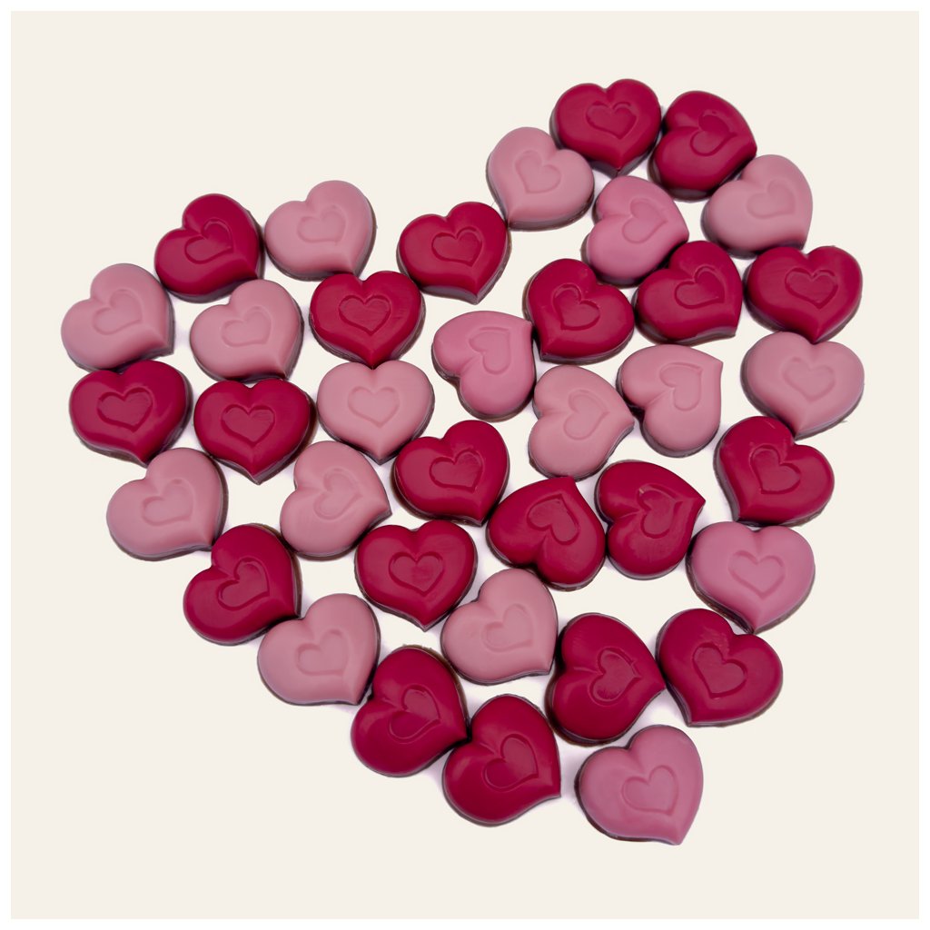 Malé čokoládové srdíčka z mléčné čokolády červené a růžové barvy. Prodáváme na váhu do sáčku. Ve 100g je cca 30 ks srdíček.