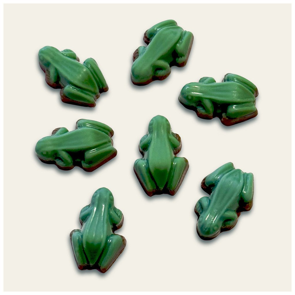 Malé amazonské žabičky z mléčné čokolády světle zelené barvy. Prodáváme na váhu do sáčku. Ve 100g je cca 30 ks žabiček.