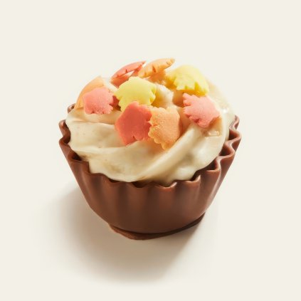 Pralinka z mléčné čokolády ve tvaru cupcaku s příchutí slaný karamel a krém z bílé čokolády a pekanových ořechů.