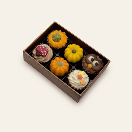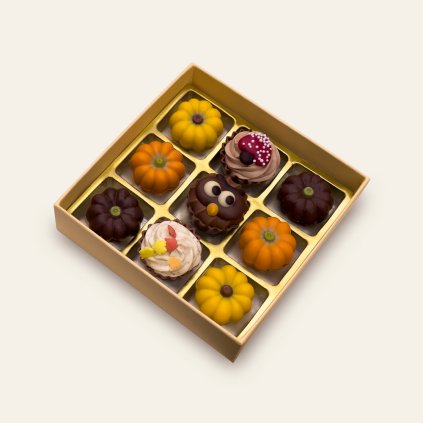 Luxusní bonboniéra sestavená z 9 ks pravých belgických pralinek z ve tvaru cupcaků bílé a mléčné čokolády v stylové krabičce bronzové barvy o rozměru 12 x 12 cm.