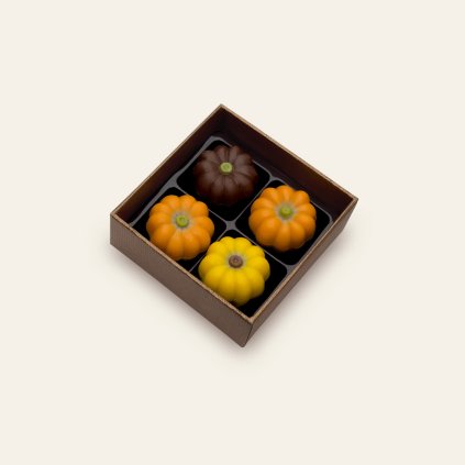 Luxusní bonboniéra sestavená z 4 ks pravých belgických pralinek z bílé a mléčné čokolády v stylové krabičce bronzové barvy o rozměru 8,5 x 8,5 cm.