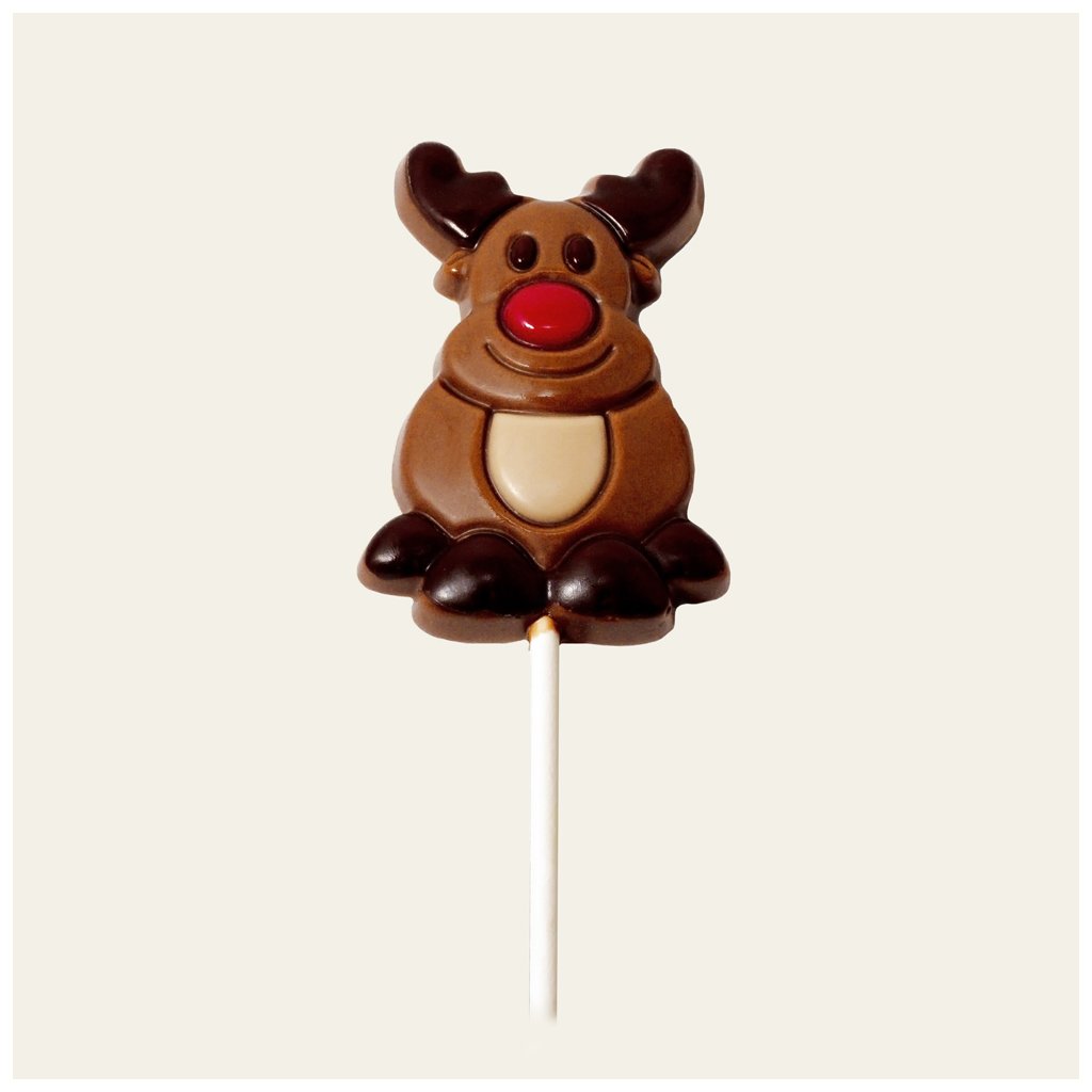 Vánoční lízátko ve tvaru Sobíka z kvalitní belgické mléčné čokolády.