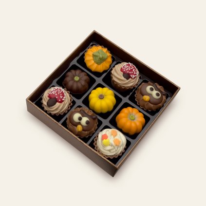 Luxusní bonboniéra sestavená z 9 ks pravých belgických pralinek z ve tvaru cupcaků bílé a mléčné čokolády v stylové krabičce bronzové barvy o rozměru 12 x 12 cm.