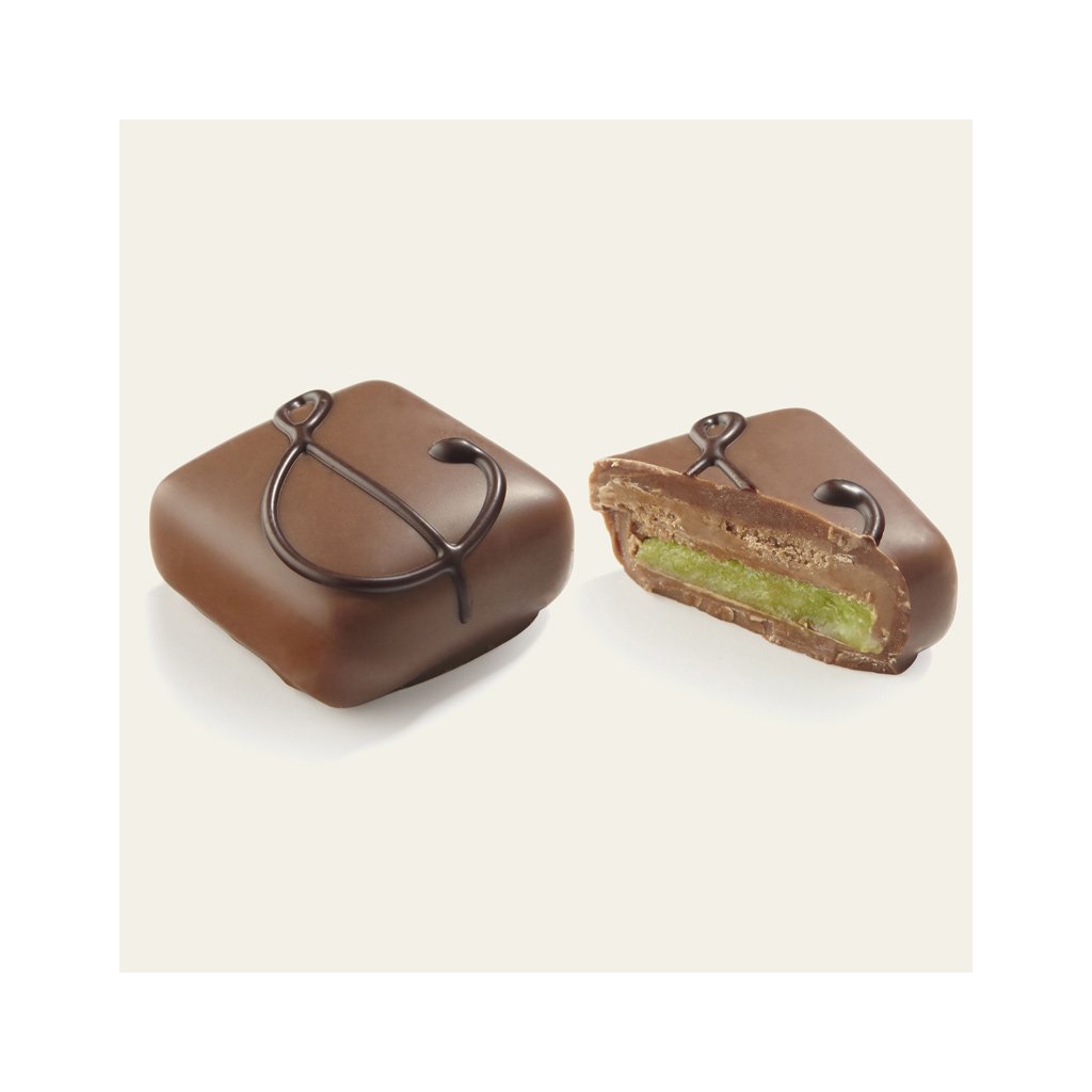 Výjimečná pralinka, v níž se snoubí jemně nasládlý pistáciový marcipán s hedvábným lískovo-oříškovým krémem. Dokonalá ořechová symfonie pro náročné gurmány dekorovaná zdobením ve tvaru houslového klíče.