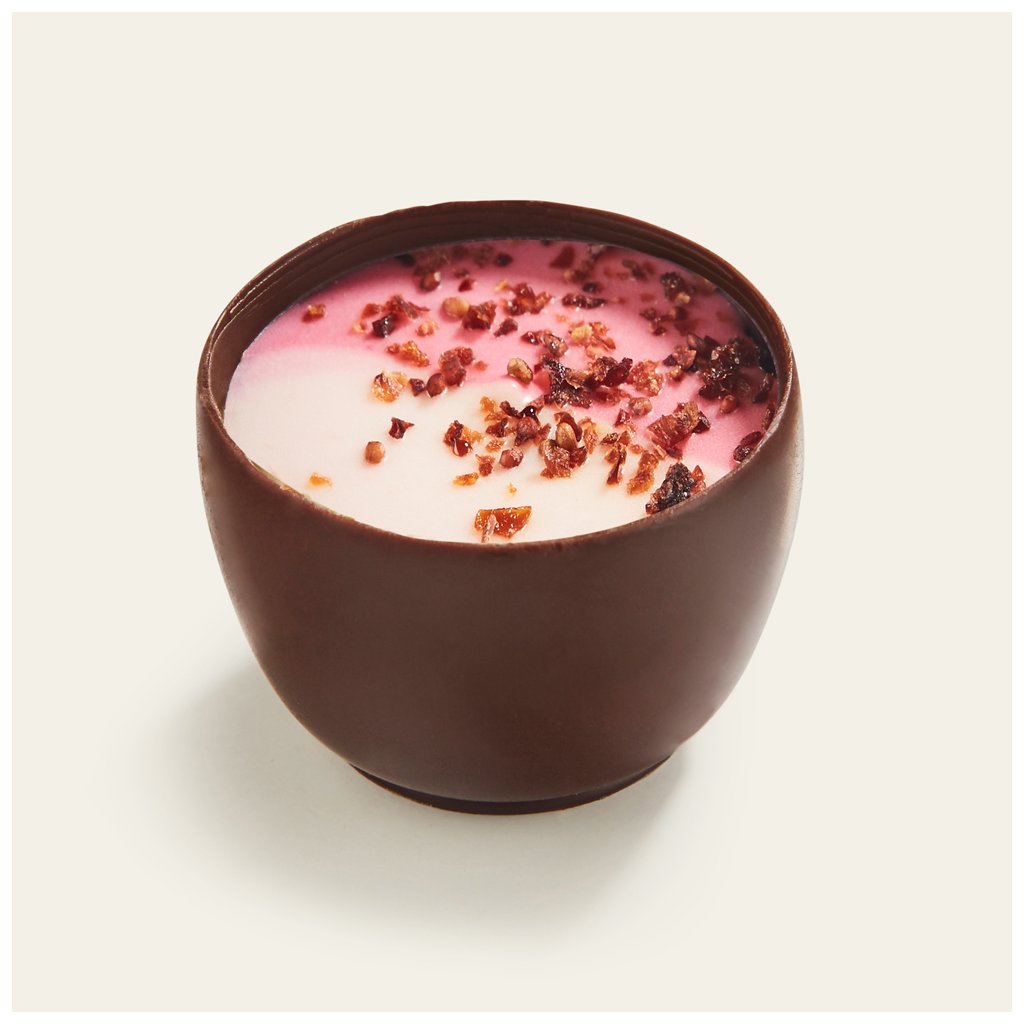 Tato pralinka z hořké čokolády má ganache náplň z malin a jahod.