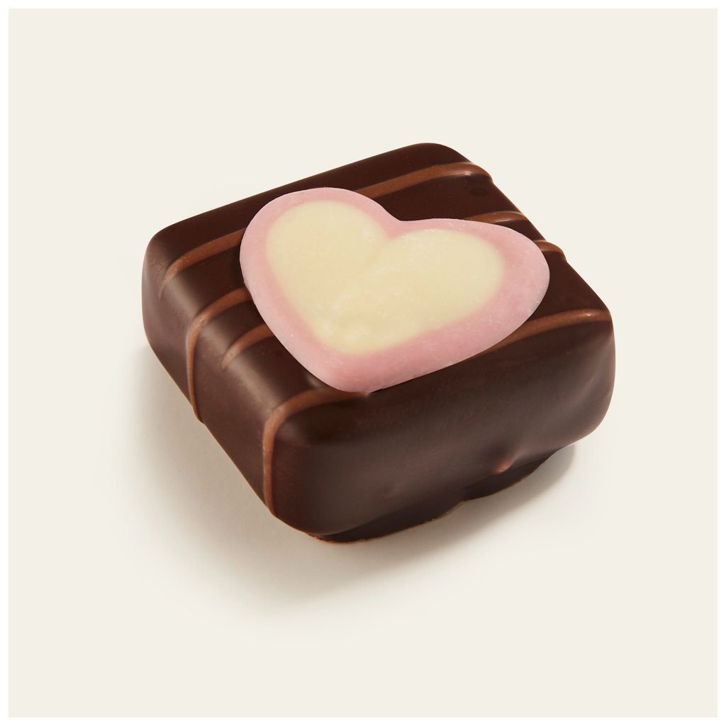 Pralinka ve tvaru čtverce z hořké čokolády s bílým srdcem a náplní z hořkého karamelu.