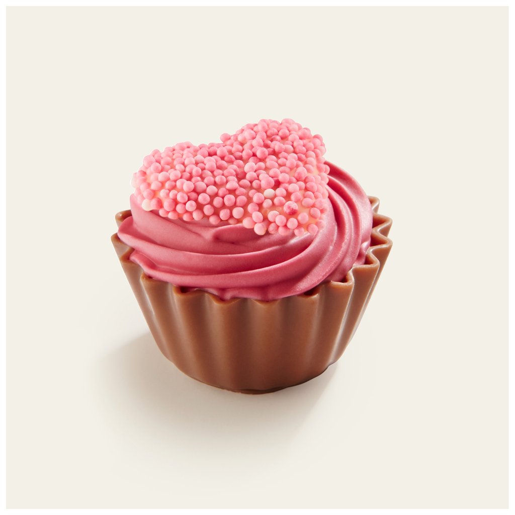 Valentýnská pralinka ve tvaru cupcaku z mléčné čokolády plněná malinovou ganache s toppingem ve tvaru srdce z bílých nebo růžových perliček