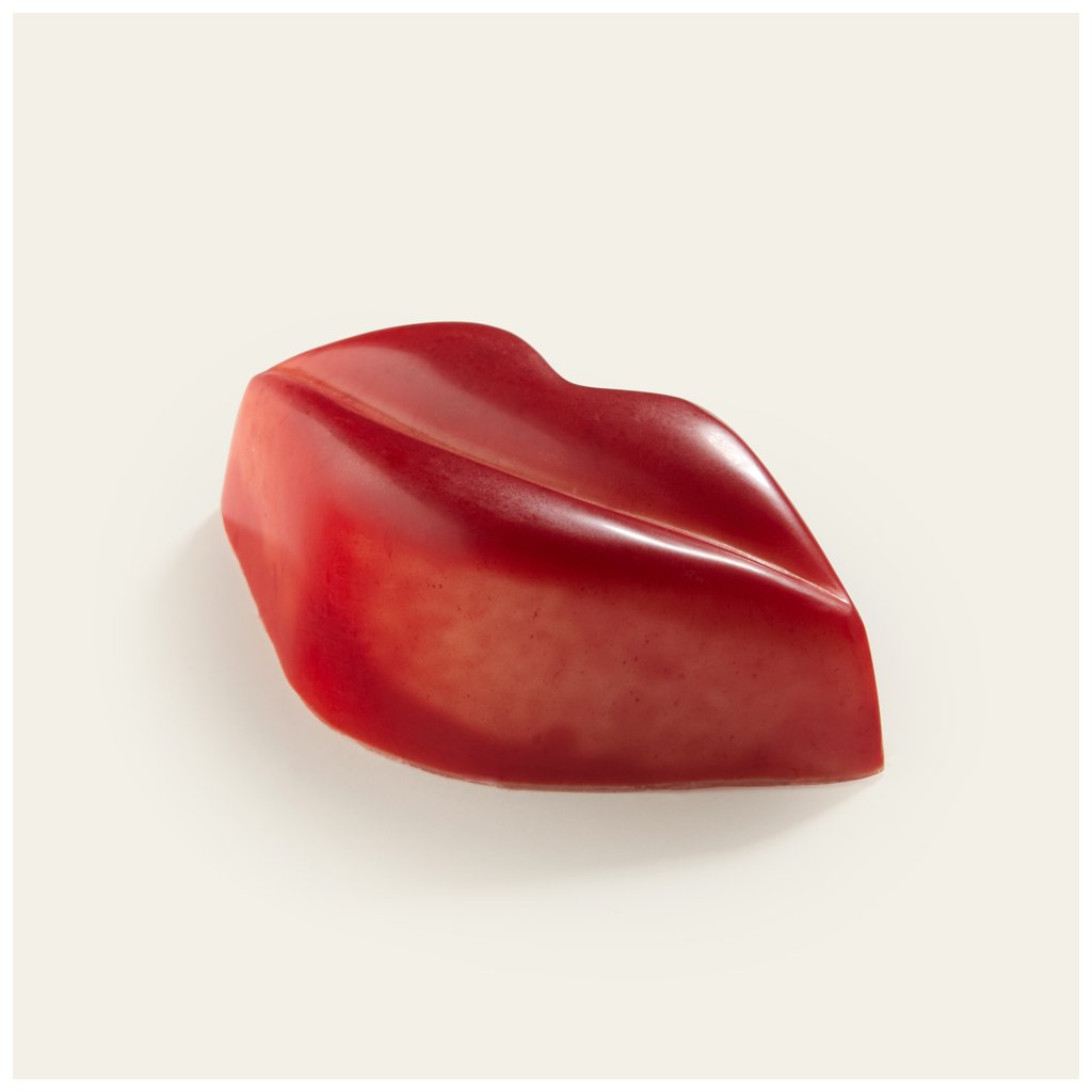 Belgická pralinka ve tvaru smyslných rtů z bílé čokolády s náplní jahodové ganache.
