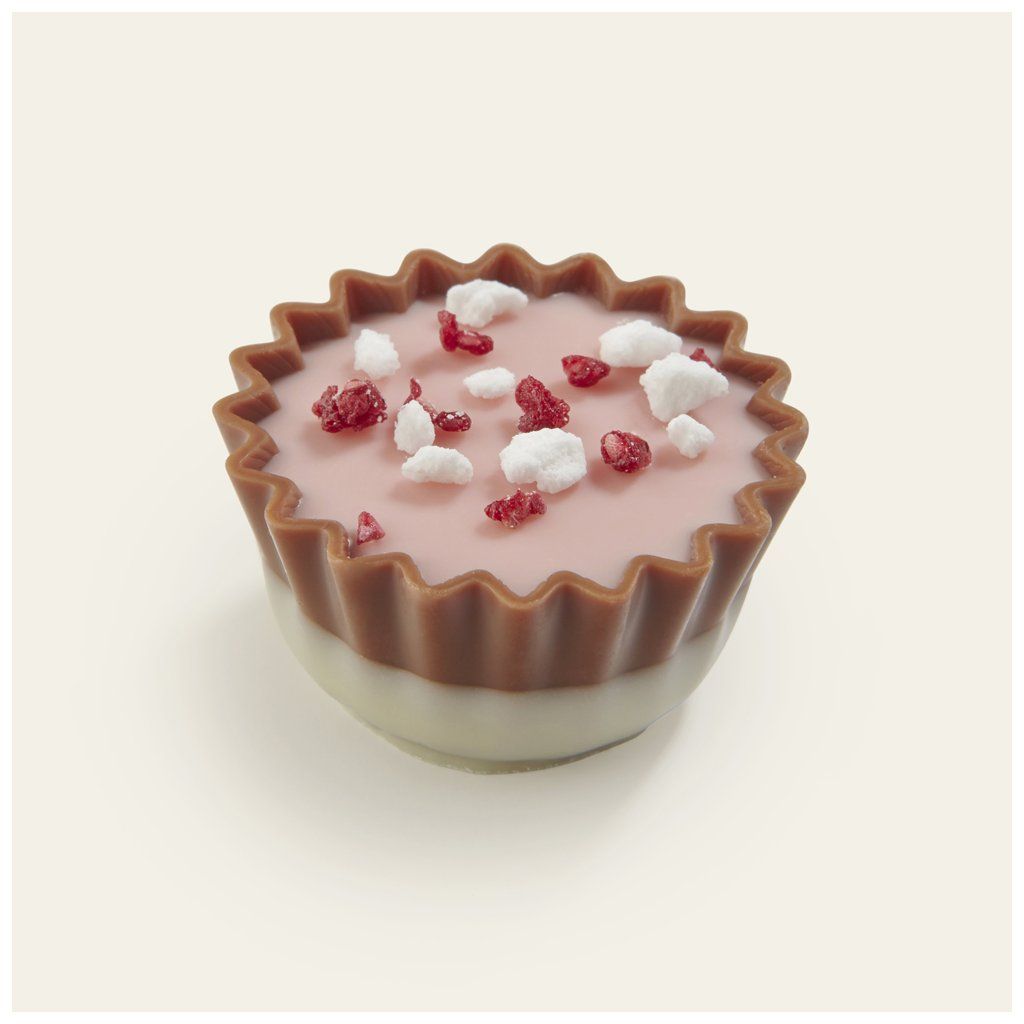 Pralinka z mléčné čokolády s bílou malinovou ganache náplní s malinovými kousky a růžový čokoládový krém.