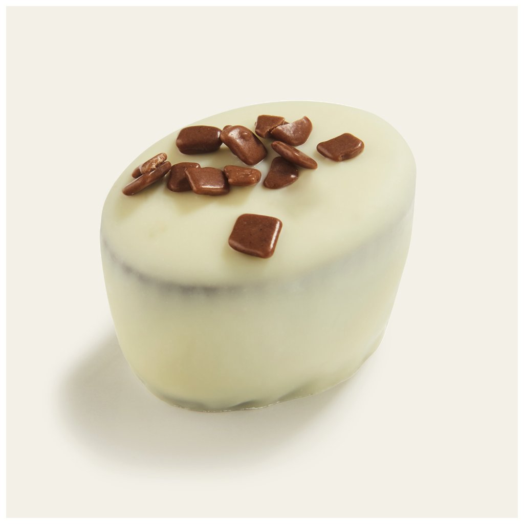 Tato pralinka má příchuť: Marcipán s příchutí Marc de Champagne v bílé čokoládě