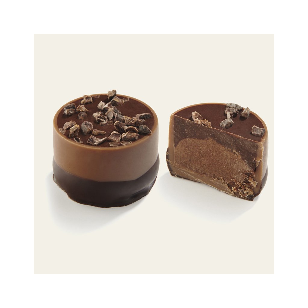 Tato pralinka má příchuť: Tmavá čokoládová pěna drcené kakaové nibsy