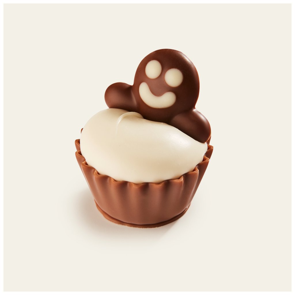 Vánoční pralinka ve tvaru perníkového panáčka z mléčné čokolády s příchutí mandlová a krém z bílé čokolády.
