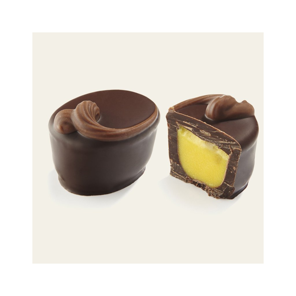 Pralinka z bohaté hořké čokolády ukrývá rafinovanou náplň z vaječného koňaku.