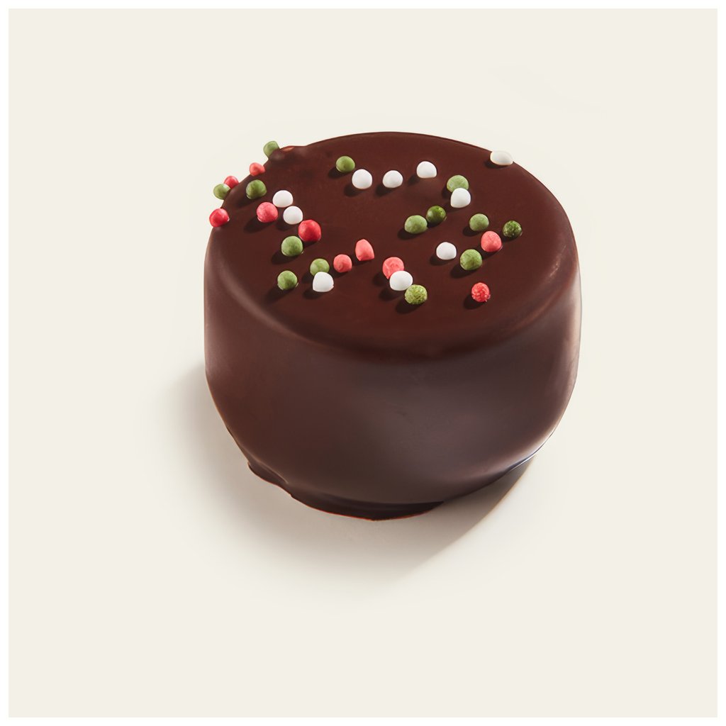 Pralinka z hořké čokolády s krémovou náplní z hořké čokolády.