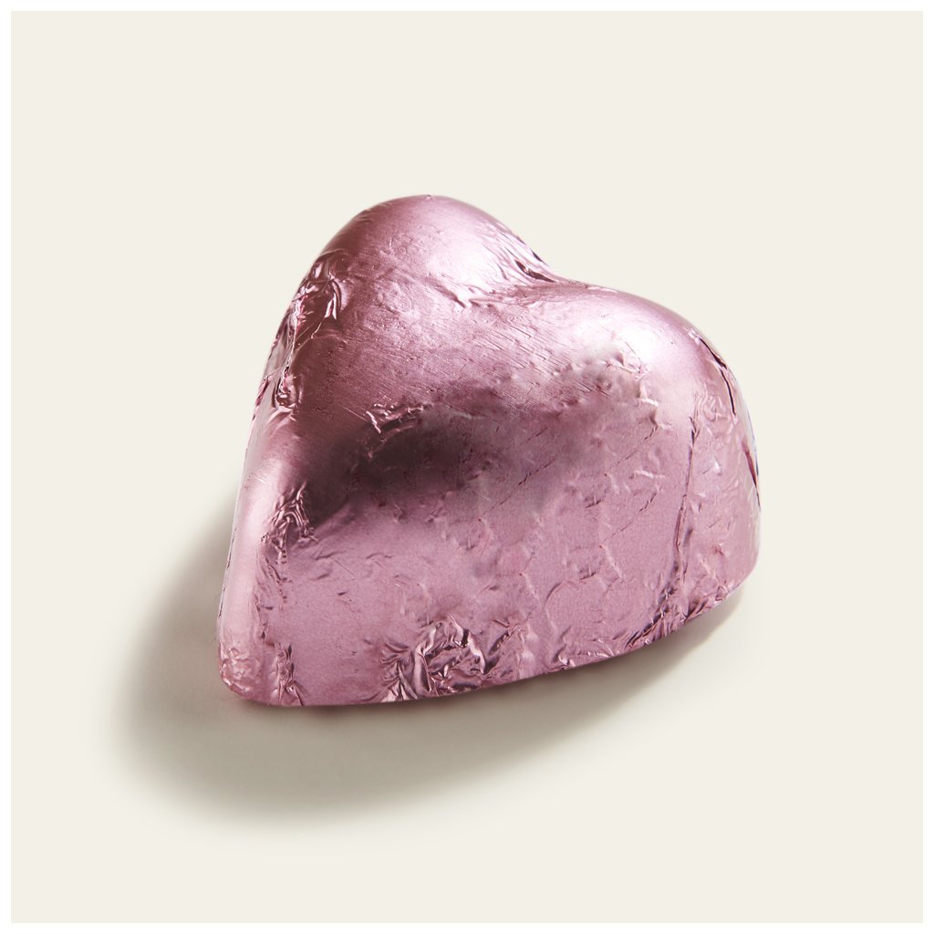 Pralinka ve tvaru srdce z mléčné čokolády a lískooříškovou náplní.