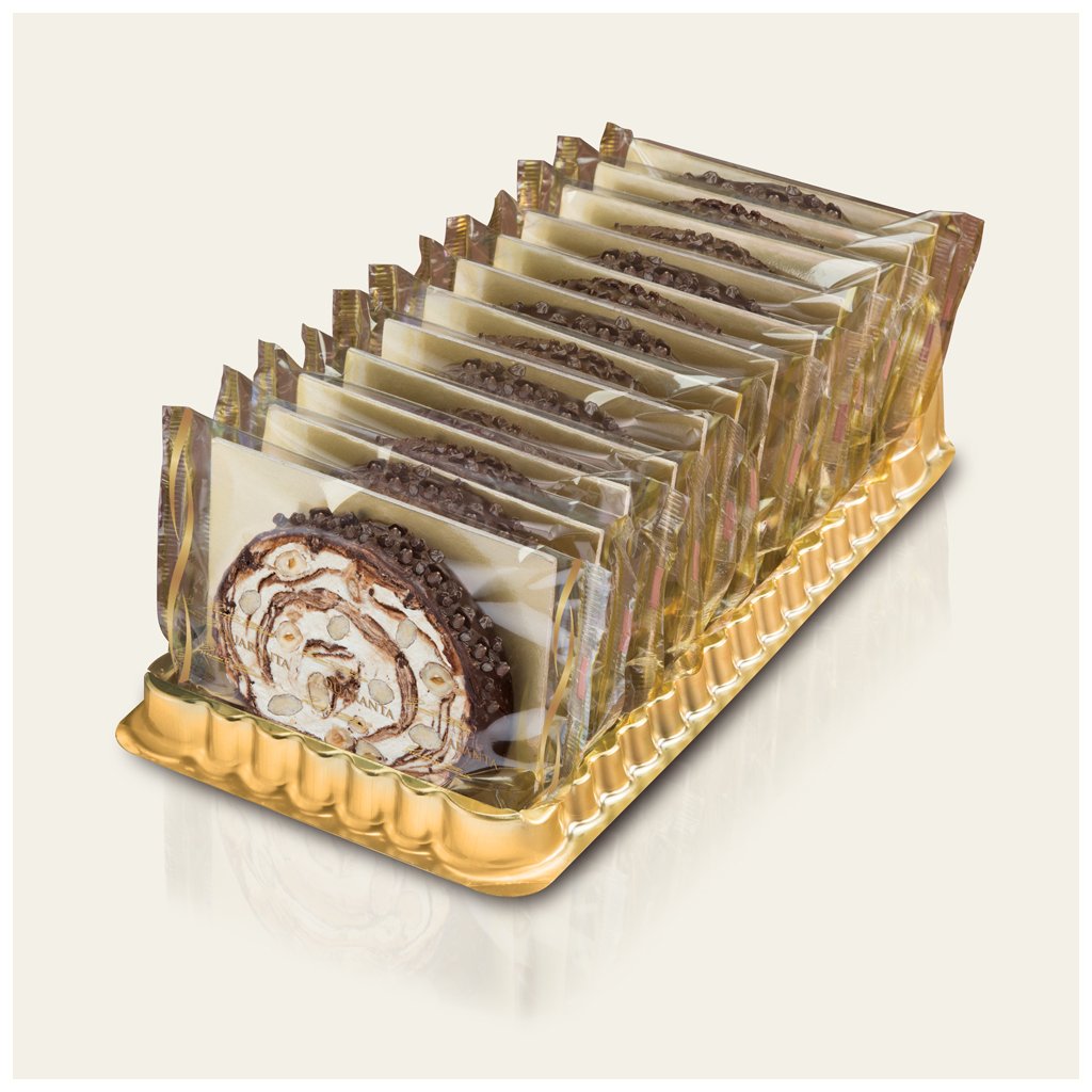 Turecký med ve formě plátku rolády z jemného a měkkého tureckého medu s hořkou čokoládou a mandlemi, zpestřeného ořechy a lahodnými krémy, zdobený na povrchu kvalitními surovinami.