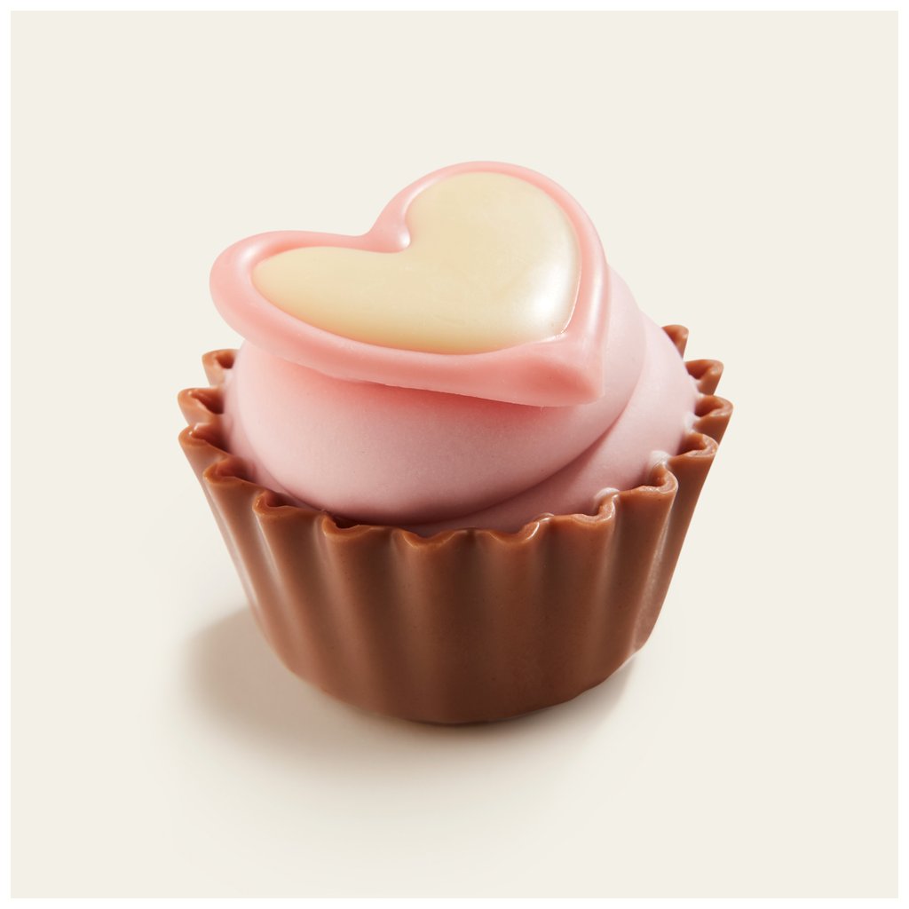 Valentýnská mandlová pralinka ve tvaru cupcaku z mléčné čokolády s krémem z bílé čokolády.