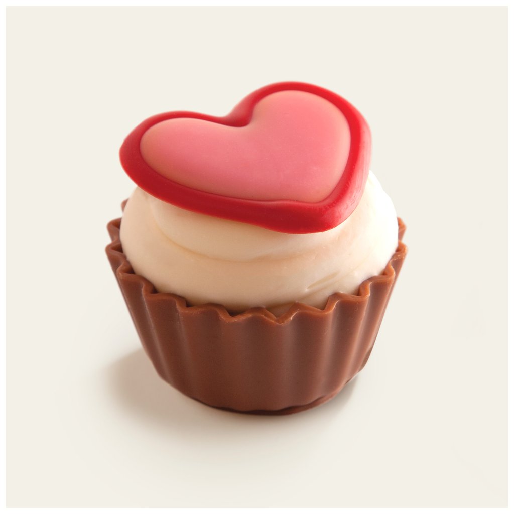 Valentýnská mandlová pralinka ve tvaru cupcaku z mléčné čokolády s krémem z bílé čokolády.